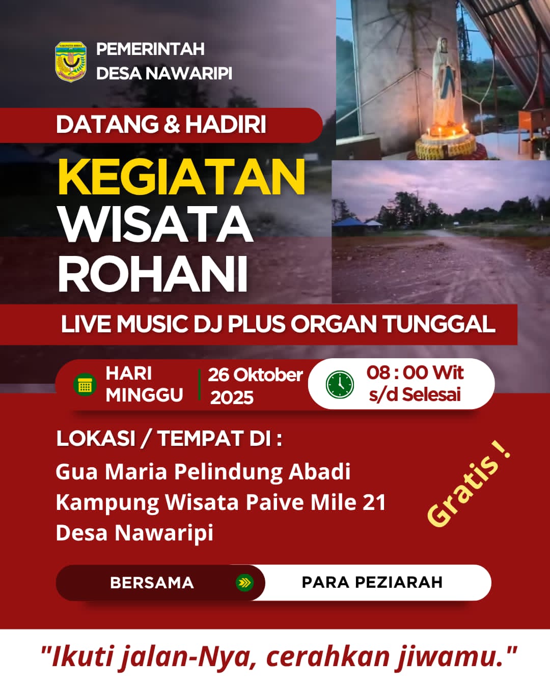 Nawaripi, 26 Oktober 2025 – Pemerintah Desa Nawaripi menggelar kegiatan Wisata Rohani di Gua Maria Pelindung Abadi, Kampung Wisata Paive Mil 21, pada Minggu (26/10/2025) pukul 08.00 WIT hingga selesai. Pemerintah Desa Nawaripi menyelenggarakan sebuah paket kegiatan bertajuk “Wisata Rohani”. Inti acara adalah ziarah dan rekoleksi di Gua Maria Pelindung Abadi, sebuah situs religi yang telah mapan. Namun, yang mencolok secara konseptual adalah infusi unsur hiburan live music DJ yang dikawinkan dengan organ tunggal. Kolaborasi musik ini tidak hanya bertujuan sebagai pengiring, tetapi juga menjadi daya tarik utama, sebagaimana tertera dalam slogan acara, “Ikuti Jalannya, Cerahkan Jiwa Mu”. Hal ini menempatkan acara ini pada spektrum yang unik: antara praktik…