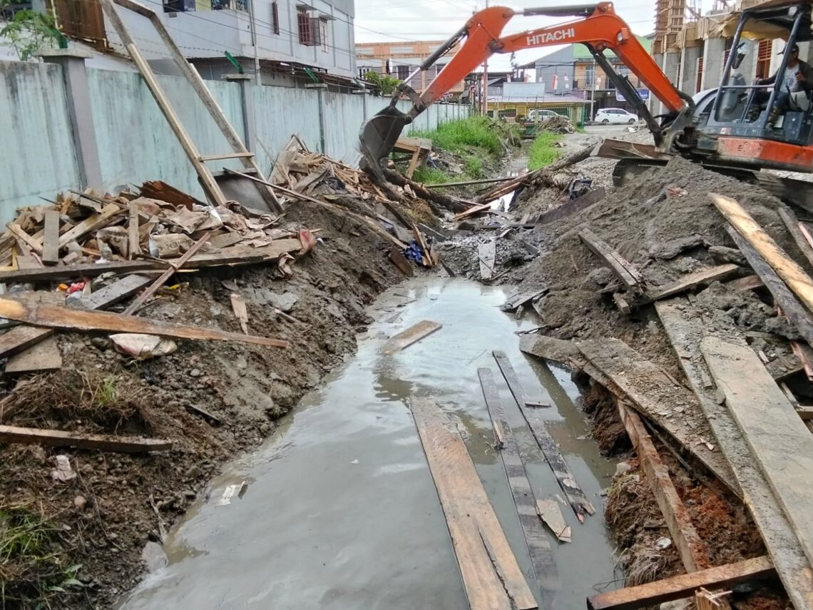 Pemerintah Distrik dan Pemerintah Kampung Nawaripi mengerahkan satu unit alat berat untuk membersihkan drainase dari tumpukan galian material, tumpukan sisa beton bangunan, tumpukan pasir, kayu yang selama ini menahan jalan air keluar ke drainase pembuangan.