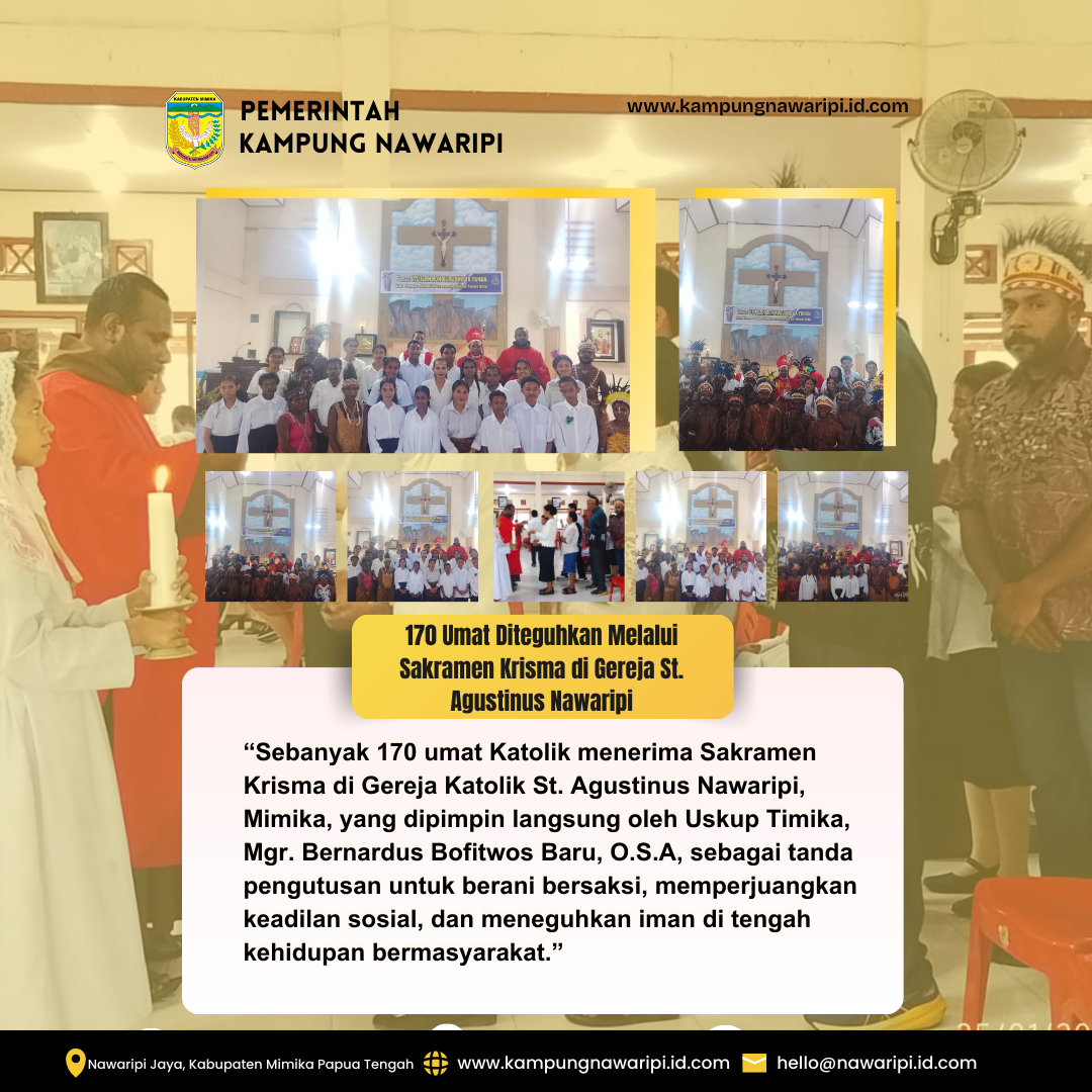 MIMIKA – Sebanyak 170 peserta menerima sakramen krisma yang dipimpin langsung oleh Uskup Timika, Mgr. Bernardus Bofitwos Baru, O.S.A, di Gereja Katolik St. Agustinus Nawaripi, Distrik Wania, Kabupaten Mimika.