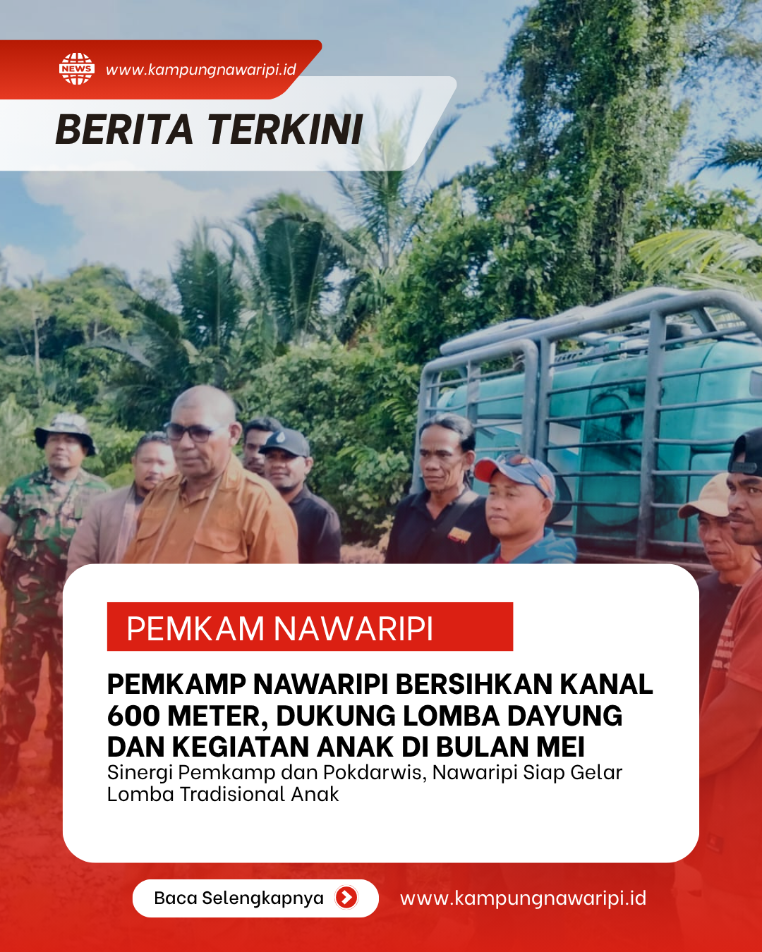 Timika, 31 Maret 2026 — Pemerintah Kampung Nawaripi, Kabupaten Mimika, mulai mempersiapkan kegiatan perlombaan tradisional bagi anak-anak dengan melakukan pembersihan kanal sepanjang 600 meter. Kegiatan ini direncanakan sebagai bagian dari rangkaian lomba yang akan digelar pada Mei 2026.